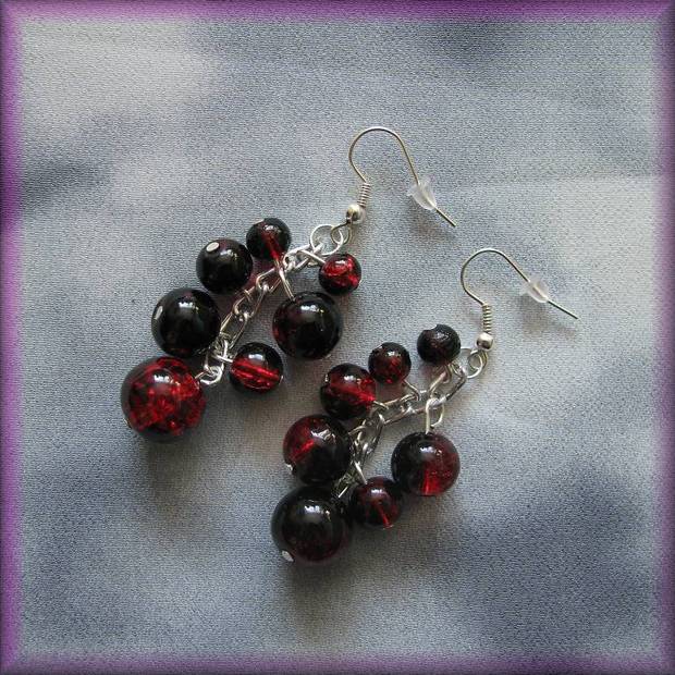 Náušnice vyrobené z červených praskaných korálků.