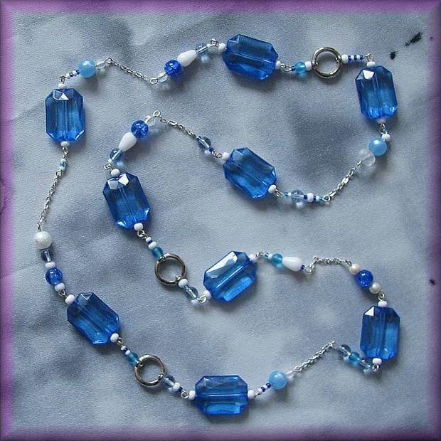 Dlouhé korále vyrobené z různých druhů a odstínů korálků modré barvy, zdobené bílými korálky, stříbrnými komponenty a stříbrným řetízkem.