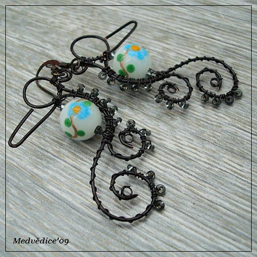 Náušnice s vinutou perlou vyrobené technikou wire-wrapping z černého lakovaného drátku připomínající ptáčky schované v keři.