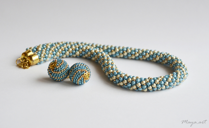 Souprava šperků je vyrobena technikou šití korálků. Byl použit rokajl různé velikosti v tyrkysových a zlatých odstínech.