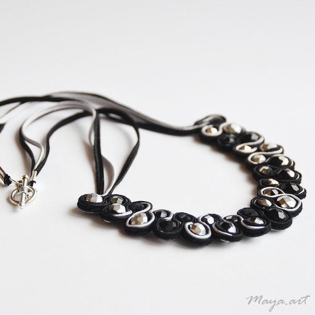 Náhrdelník je vyroben technikou prýmkování z tzv. sutašek černé a šedé barvy a černostříbrných broušených korálků.