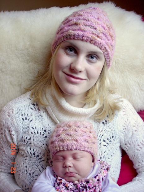 Čepičky pro maminku a miminko mnou upletené jako dáreček. Z příze od milé 0negRH.