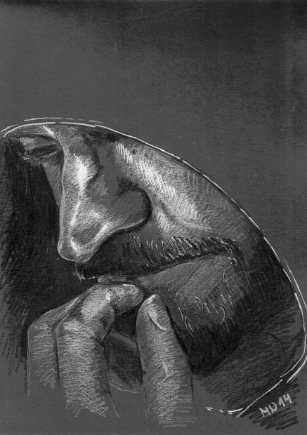 Kresba bílou a černou pastelkou a fixem na tmavý papír. Formát A4. Kresba podle fotografie, model Nikolaj Coster-Waldau, upraveno pro účely ilustrace k textu.