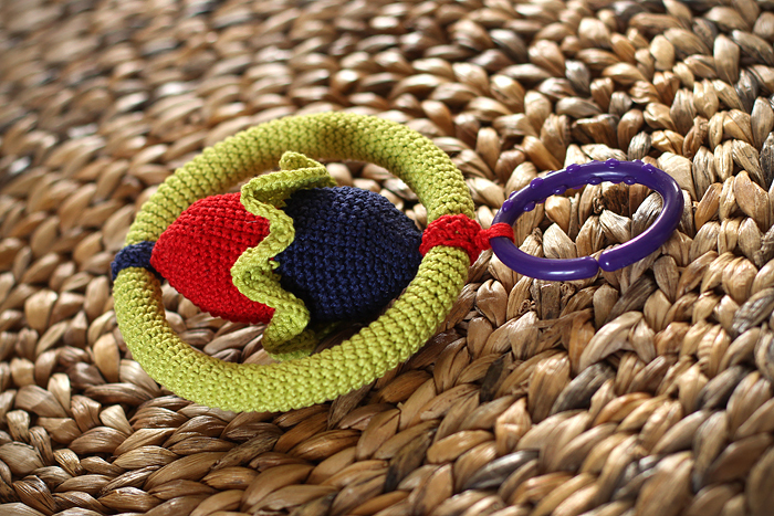 Vyrobené z bavlněných přízí s atestem bezpečnosti pro miminka. Kruh je pevný, plastový. Střed je vyplněný dutým vláknem a má uvnitř atestované