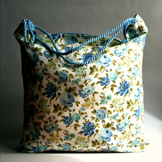 Kolekce vznikla spojením bavlněného hrubšího materiálu květovaného potisku, režného lnu, modré bavlněné dekorační látky hrubšího tkaní a uch z atlasových točených šňůr.