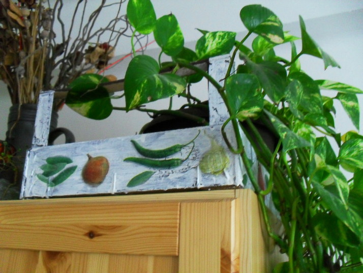 obyčejná bedýnka od ovoce,natřená barvou a polepená ubrousky,použito krakelování