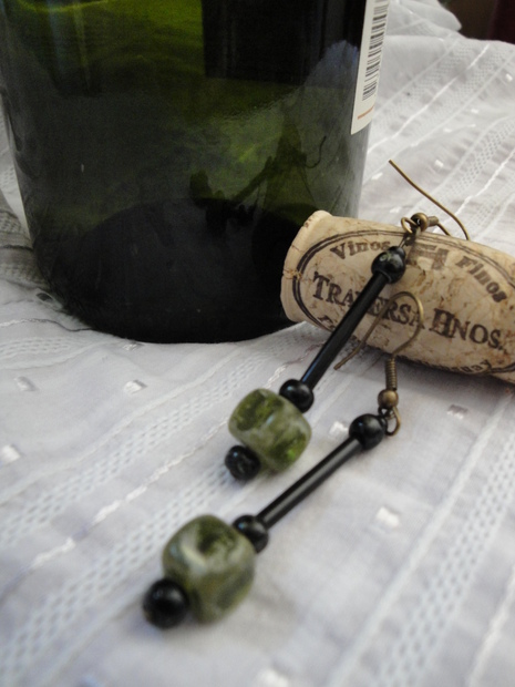 Lahvově zelený korálek jako lesní jezero v kombinaci s černým sklem dává těmto náušnicím vzhled starožitnosti.