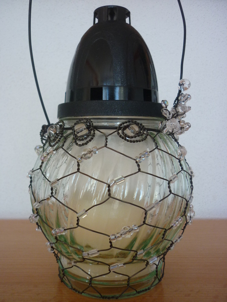 Větší hřibitovní lucerna odrátovaná černým drátem a zdobená čirými skleněnými korálky.