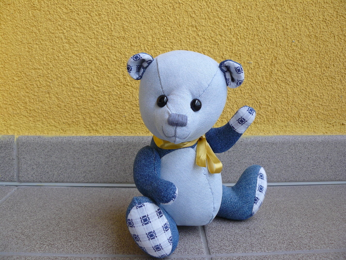Džínový medvídek ušitý v rámci swapu klubu medvědářek.