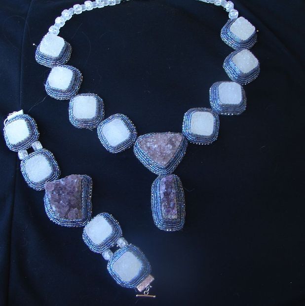 Kostky surového křišťálu obšité japonským rokajlem,uprostřed drůzy z ametystu.