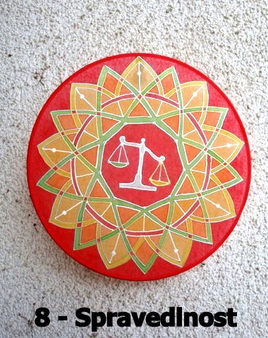 mandalka : zelená a žlutá, to jsou cesty po kterých chodíme, červené body ( překážky na cestách ), červený kruh ( někdy se točíme v kruhu, protože děláme stejné chyby ) váha uprostřed znamená příčinu a důsledek