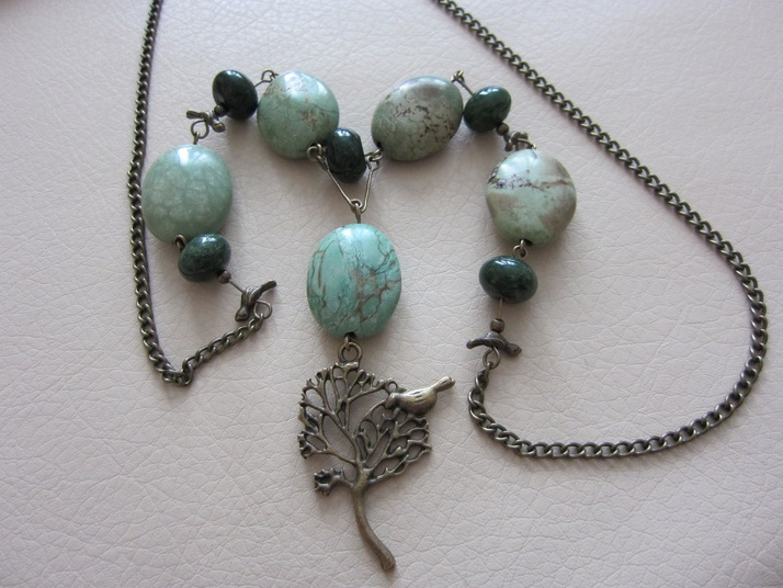 Náhrdelník je vytvořen ve stylu vintage z komponentů z obecného bižuterního kovu v úpravě starobronz a polodrahokamů zeleno hnědého howlitu a tmavě zeleného aventurínu.