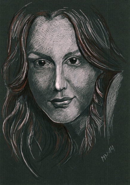 Formát A3. Pastelky a bílé gelové pero na černém papíru. Kresba podle fotografie, model Leighton Mester