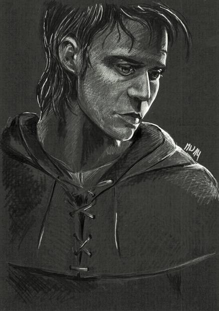 Formát A3. Pastelky a bílé gelové pero na černém papíru. Kresba podle fotografie, model Kris Allen