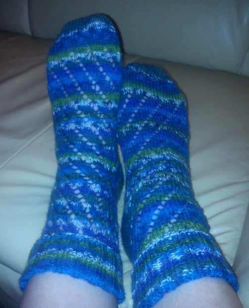 Letní dírkaté ponožky z tenoučké příze Fabel od Drops. Pleteno na jedné kruhovce zároveň od špičky, kruhovka od KnitPro číslo 2. Zakončeno pružným okrajem
