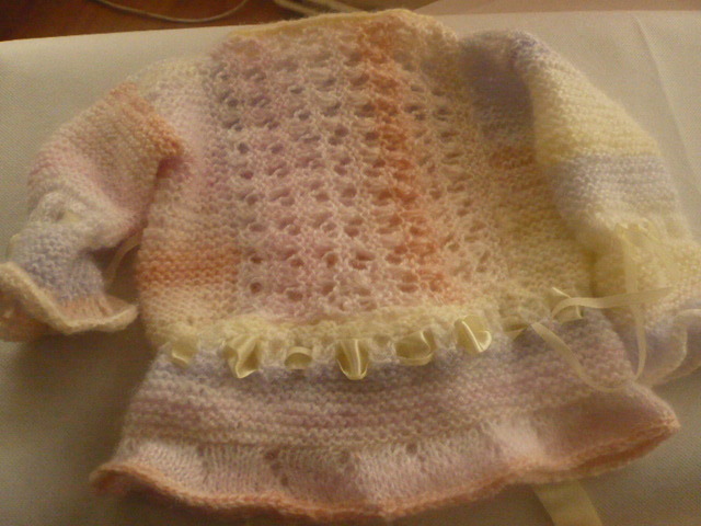 Kabátek pro vnučku ,ručně pletený ,vzadu zapínání na 6 knoflíčků , ozdobné mašle .