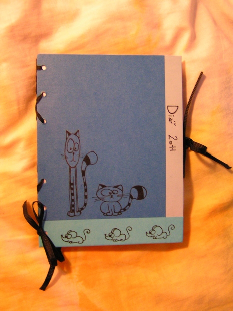 Diář na rok 2011, velikost A6, vlastní sazba, autorský obrázek koček a myší, přední desky různé odstíny modré barvy, zadní desky černé, svázáno černou stužkou, dvě stužky ze strany na zavázání