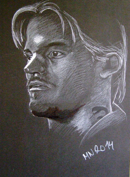 Formát A3, kresba pastelkami a bílým gelovým perem na řerný papír. Kresba podle fotografie, model Nikolaj Coster-Waldau jako Ossy z filmu Vildspor (Dánsko, 1998)