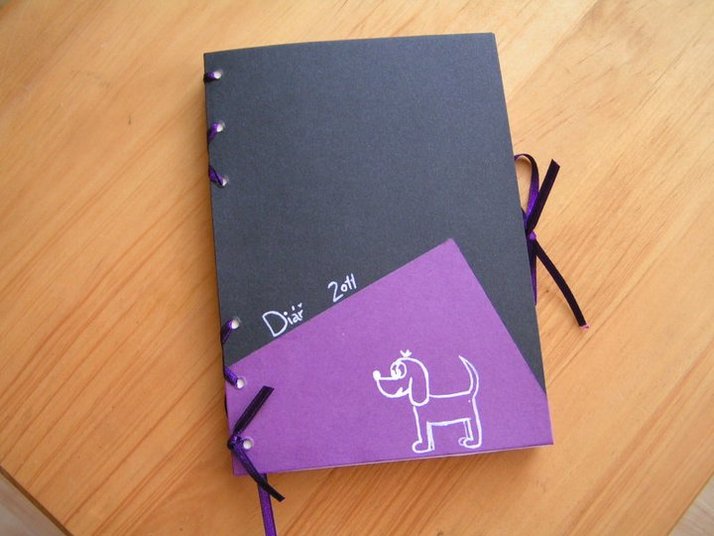 Diář na rok 2011, velikost A6, vlastní sazba, přední desky jsou fialové v kombinaci s černou, s autorským obrázkem pejska, zadní desky jsou černé.