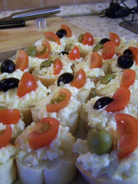 Ozdobeno olivami a cherry rajčátky.