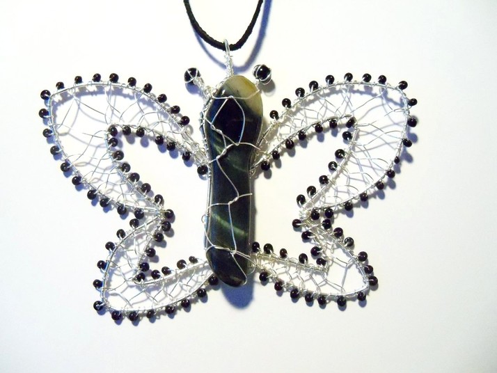 Drátovaný a velice náročný šperk ve tvaru motýlka. Tělo tvoří polodrahokam sokolí oko, na vrchu s příměsí tygřího oka. Jemně vyplétaná křídla jsou obroubena tmavými rokajly, ze kterých jsou také vytvořena tykadla motýlka.