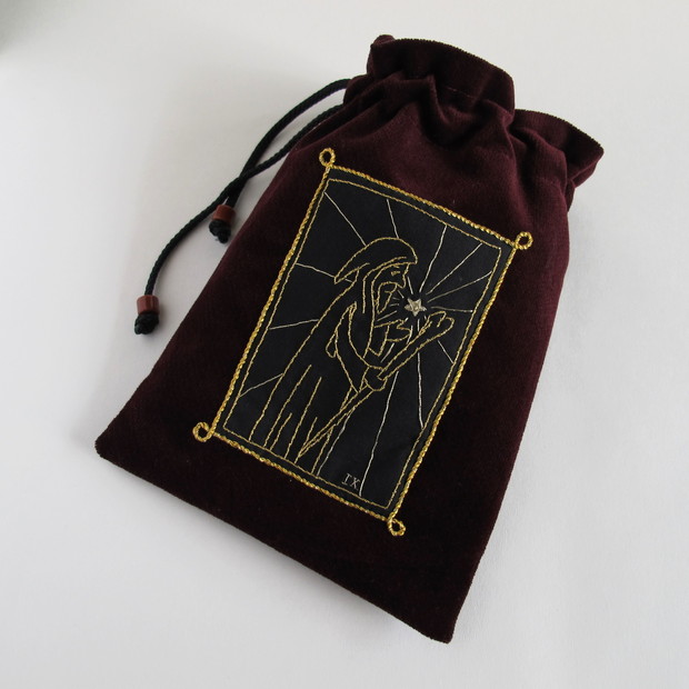 Pytlík na karty s motivem Poustevníka. Samet, bavlna, zlatá výšivka, vypodšívkováno. Rozměry 15x21 cm.