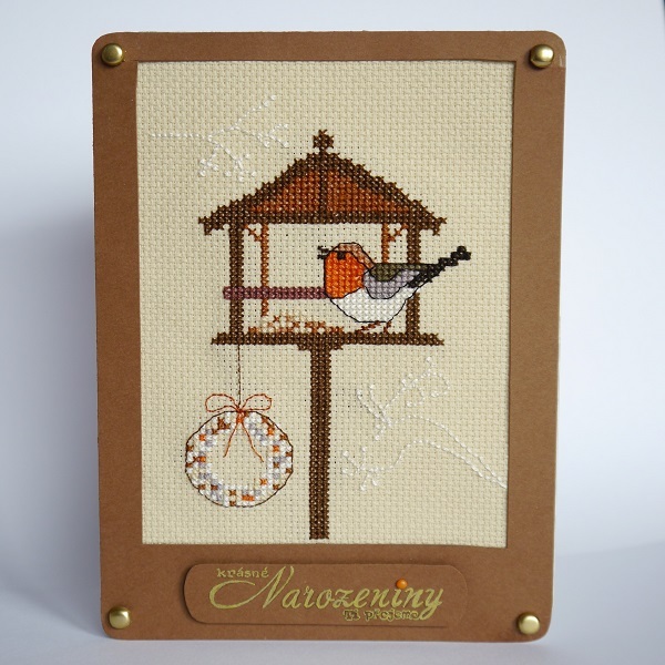 Přání s vyšitým ptáčkem v krmítku křížkovým stehem v hnědém rámečku se zlatými hřebíčky.