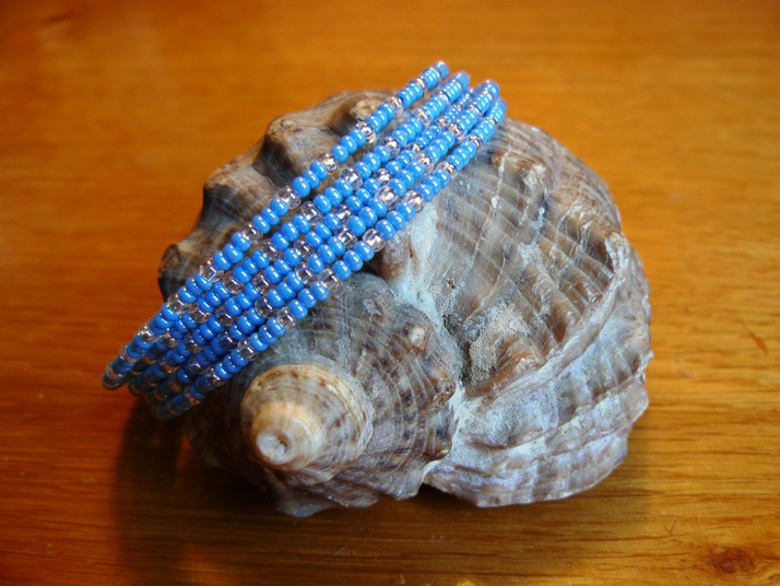 Použity byly rokajlové korálky modré barvy s perletí a čirý rokajl.