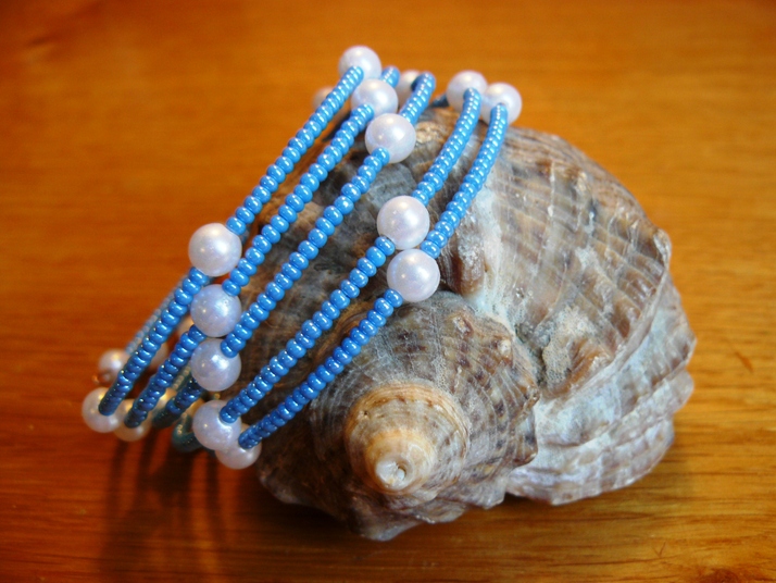 Použity byly rokajlové korálky modré barvy s perletí a perličky.