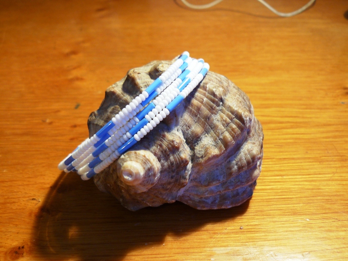 Použity byly rokajlové korálky bílé barvy a sekaný modrý rokajl.