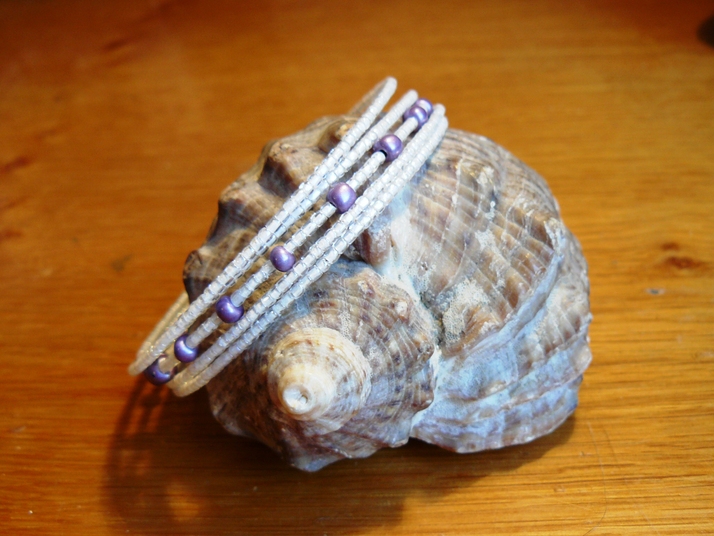 Použity byly rokajlové korálky smetanové barvy s perletí a fialové korálky (světlejší).