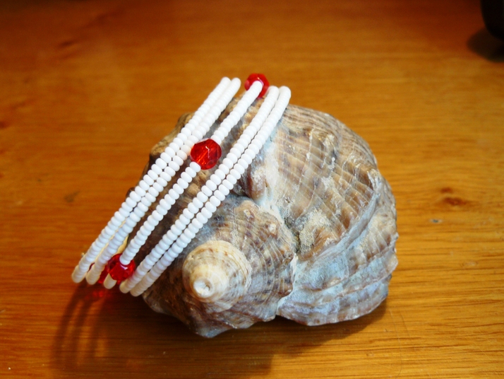 Náramek bílý s červenými brouš. korálky