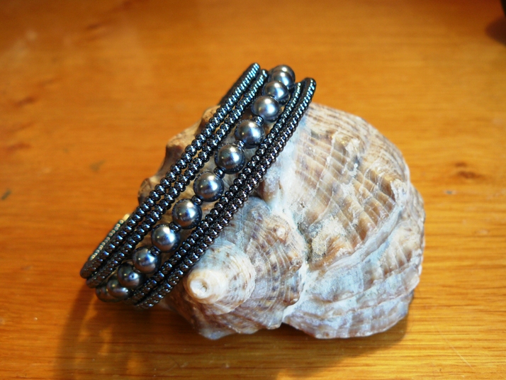 Použity byly rokajlové korálky antracitové barvy s perletí a perličky.