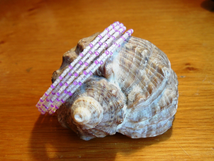 Použity byly rokajlové korálky smetanové barvy s perletí a skleněný rokajl s fialovým průtahem.