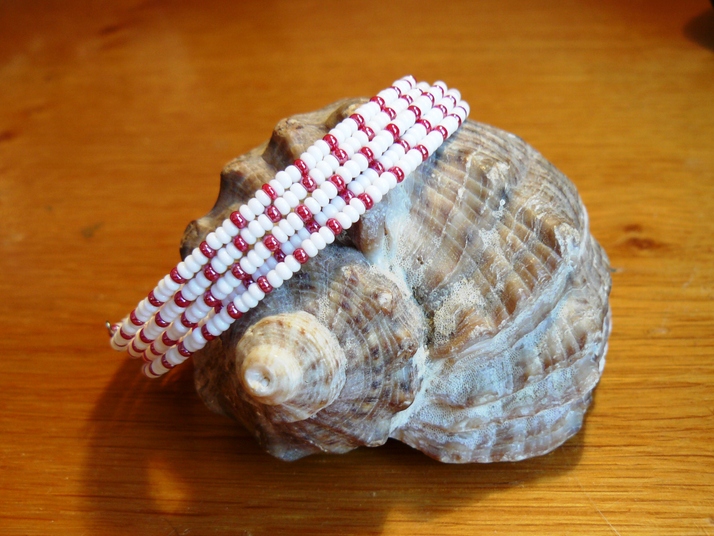 Použity byly rokajlové korálky čistě bílé barvy v kombinaci s tmavě červeným rokajlem s perletí.