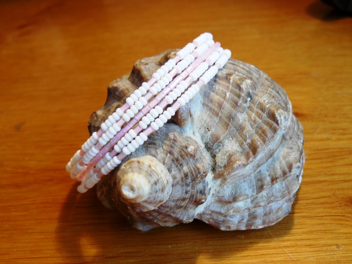 Použity byly rokajlové korálky čistě bílé barvy v kombinaci s růžovým sekaným rokajlem.