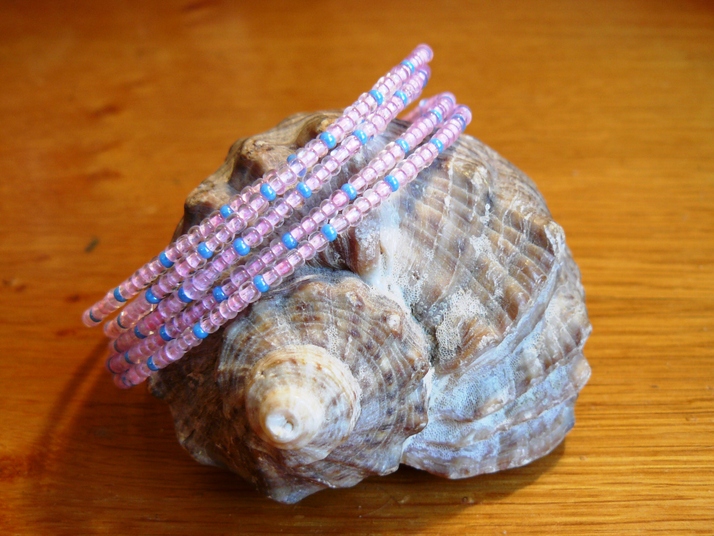 Použity byly rokajlové korálky růžové barvy v kombinaci s modrým rokajlem.