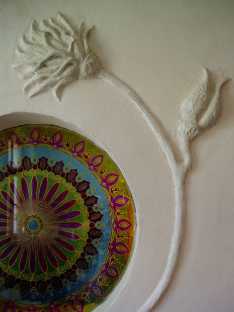 Kulaté okno mezi ložnicí a kuchyní s plastikou květiny.