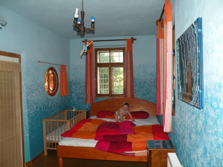 Ložnice vymalovaná mořskou houbou .Je doplněna teplými barvami v detailech,aby nepůsobyla chladně.