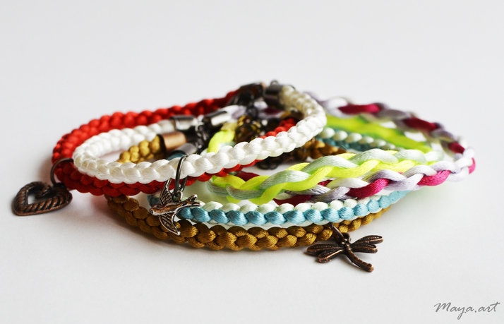 Náramky vyrobené ze saténových šňůr starou japonskou technikou splétání provázků, kumihimo.
