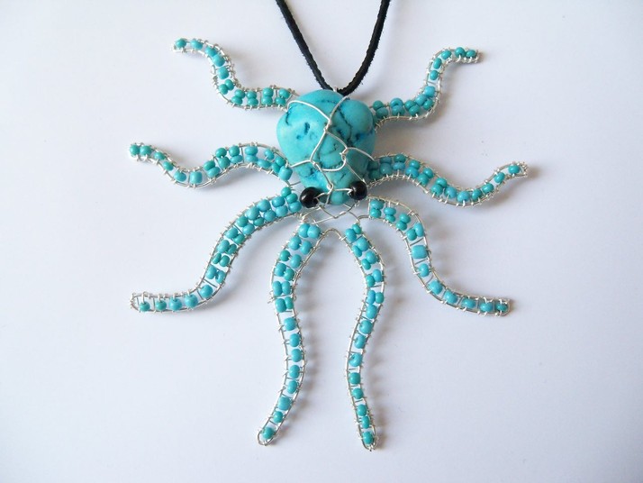Drátovaná chobotnice, jejíž hlavu tvoří polodrahoam Tyrkenit je jemně vyplétána tyrysovými rokajly, představujícími chapadla a černými roajly, zastupujícími oči.