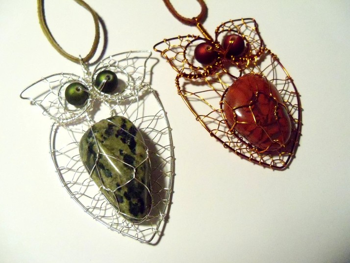 Sovičky jsou vyrobeny z minerálů Nefrit a Karneol a jejich oči jsou tvořeny matnými plastovými korálky v barvě minerálu.