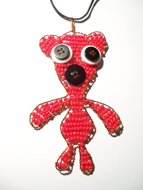 Náročný drátovaný šperk ve tvaru filmové postavičky Kukyho. Tento červený medvídek je tvořen malými rokajly a černými a bílými knoflíčky.