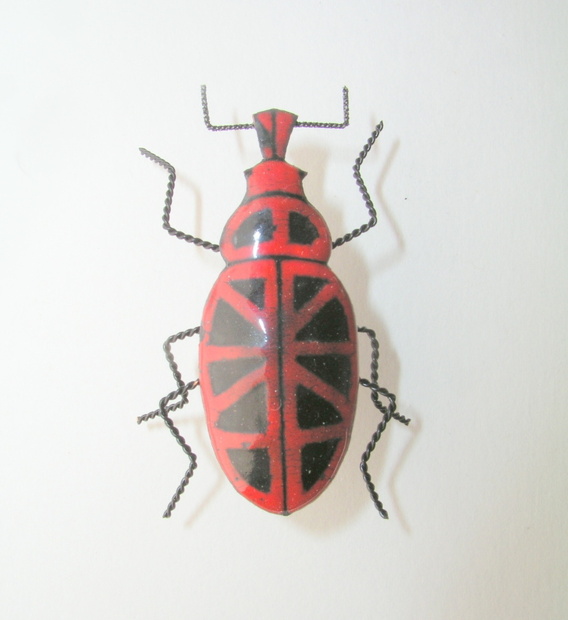 Klikoroh s vyskládanými trojúhelníky. Je osazený do entomologické kazety s dalšími osmi smaltovanými brouky.