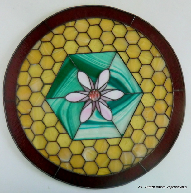 Na jaře rozkvétají stromy a začínají létat včelky, tak tady jedna moje kouzelná vitráž. Velikost: průměr 54 cm
