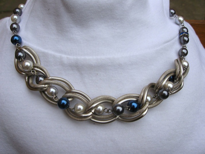 masívní řetěz z hladkých a vroubkovaných oček z hliníku (přes masívnost ej tedy lehký) vyplétaný voskovými kuličkami v tm. šedé, smetanovošedé a tm. modré barvě