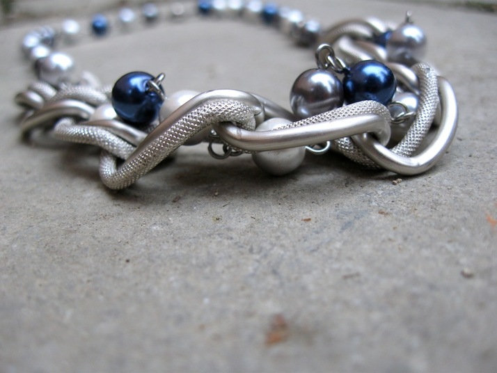 masívní řetěz z hladkých a vroubkovaných oček z hliníku (přes masívnost ej tedy lehký) vyplétaný voskovými kuličkami v tm. šedé, smetanovošedé a tm. modré barvě