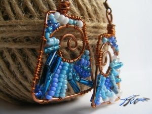 Drátované náušnice propletené modrým rokailem. Jedny z mých prvních kousků.