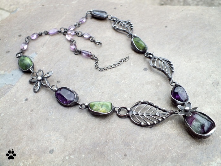 jadeit/nefrit,ametyst,fluorit,ručně vyrobené díly z cínu,drátu,zakončeno korálky z ametystu
