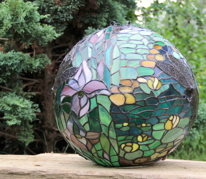 Stínidlo na světlo s motivem honících se vážek. Velikost průměr cca50 cm. Čtyři filigránové vážky, sklo, acháty.